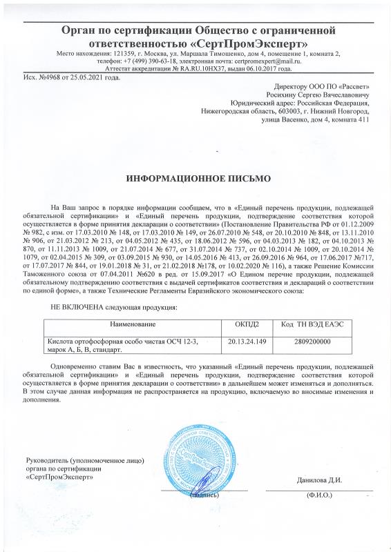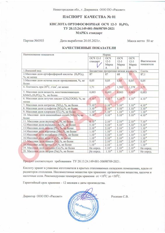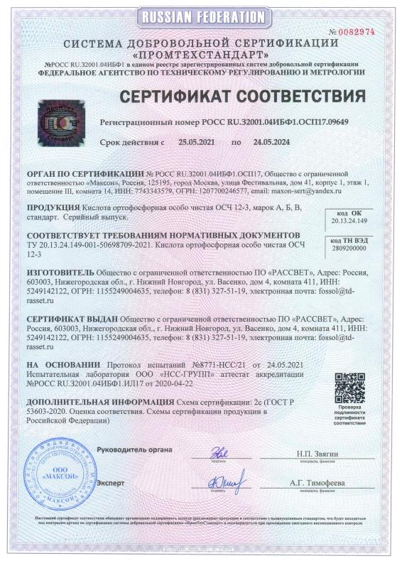 Ортофосфорная кислота ОСЧ ТУ 20.13.24.149-001-50698709-2021